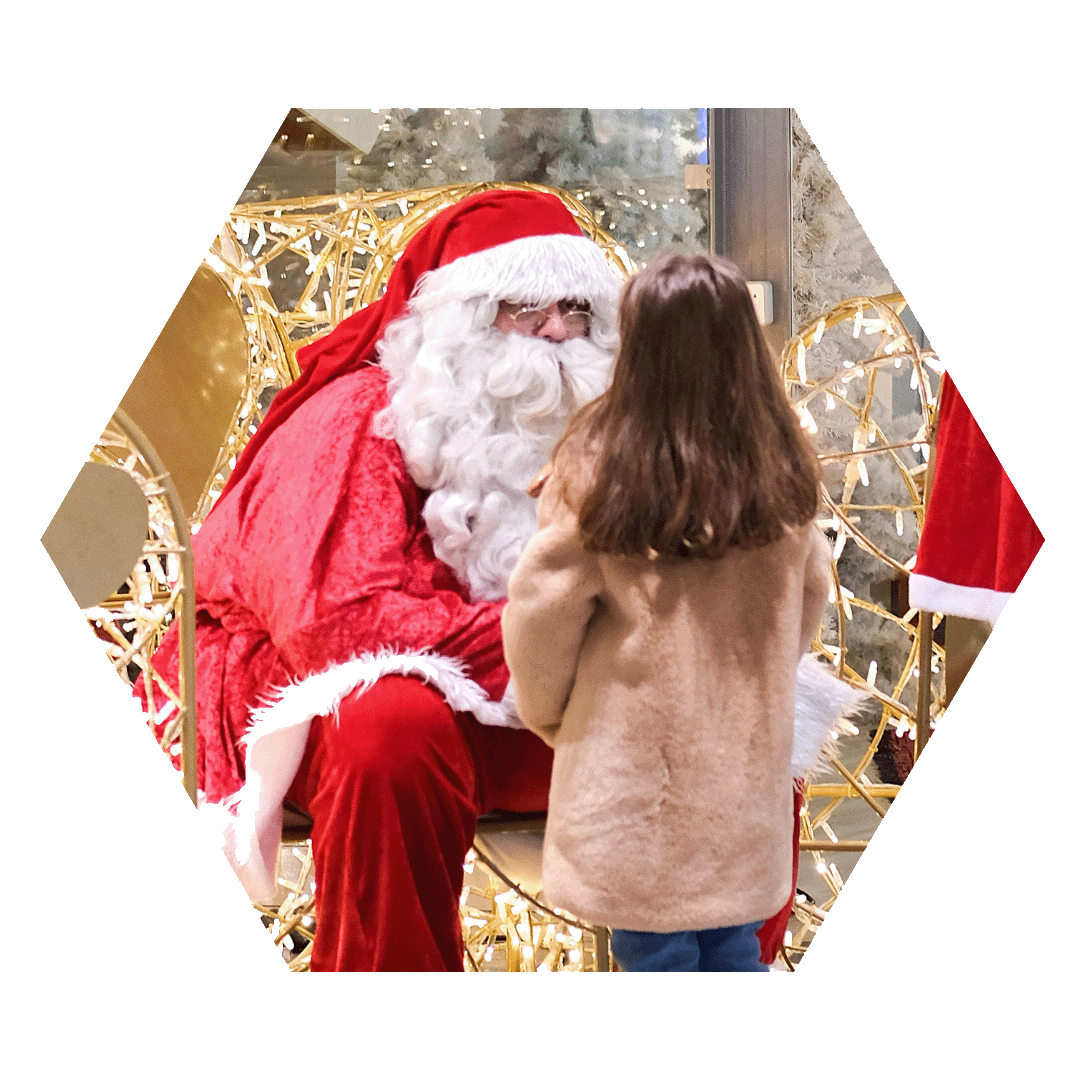 Joulupukki ottaa vastaan lasten toiveita 2. kerroksessa valonallen luona